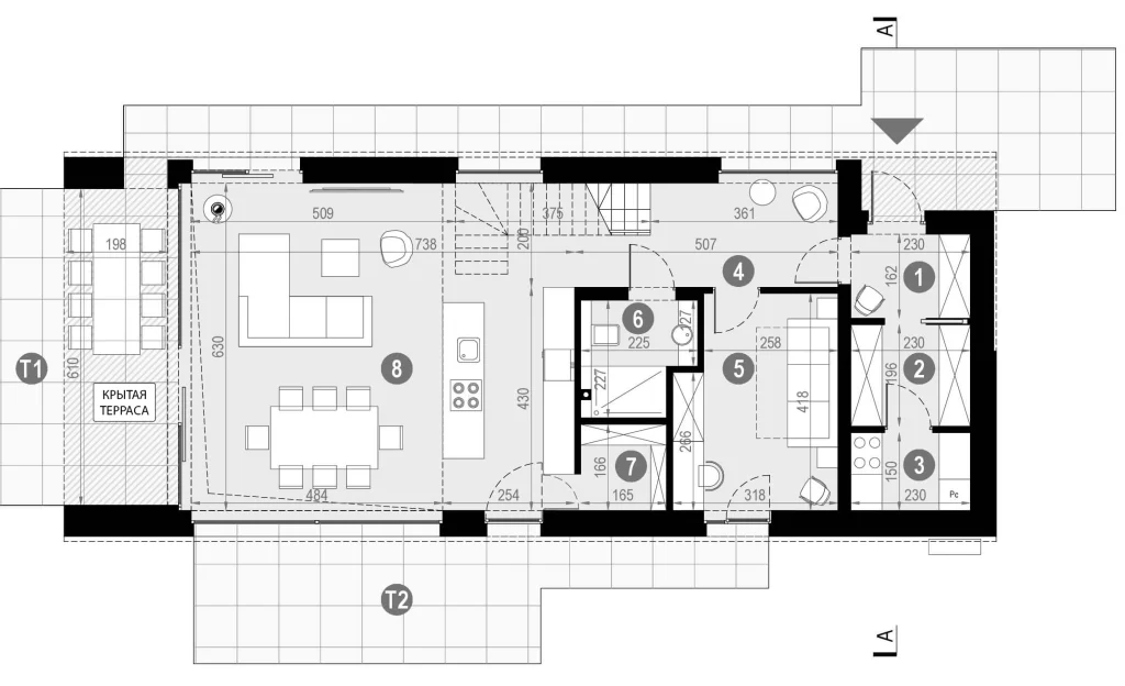 Функциональная планировка дома обеспечивает удобное зонирование, максимальное естественное освещение и комфорт для всей семьи. Каждое решение направлено на создание гармоничного пространства, в котором будет приятно жить и отдыхать.