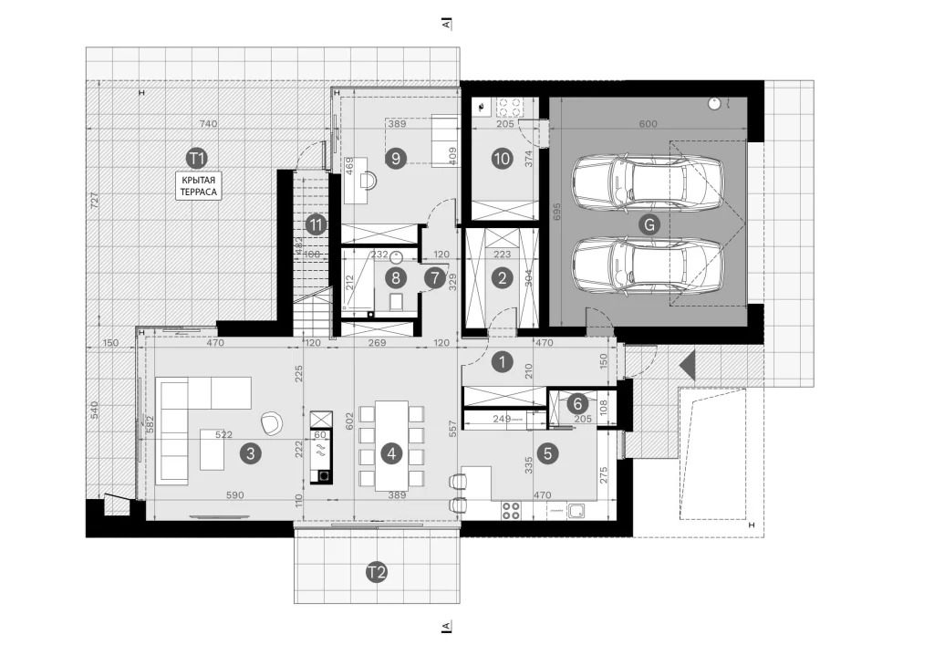 Функциональная планировка дома обеспечивает удобное зонирование, максимальное естественное освещение и комфорт для всей семьи. Каждое решение направлено на создание гармоничного пространства, в котором будет приятно жить и отдыхать.
