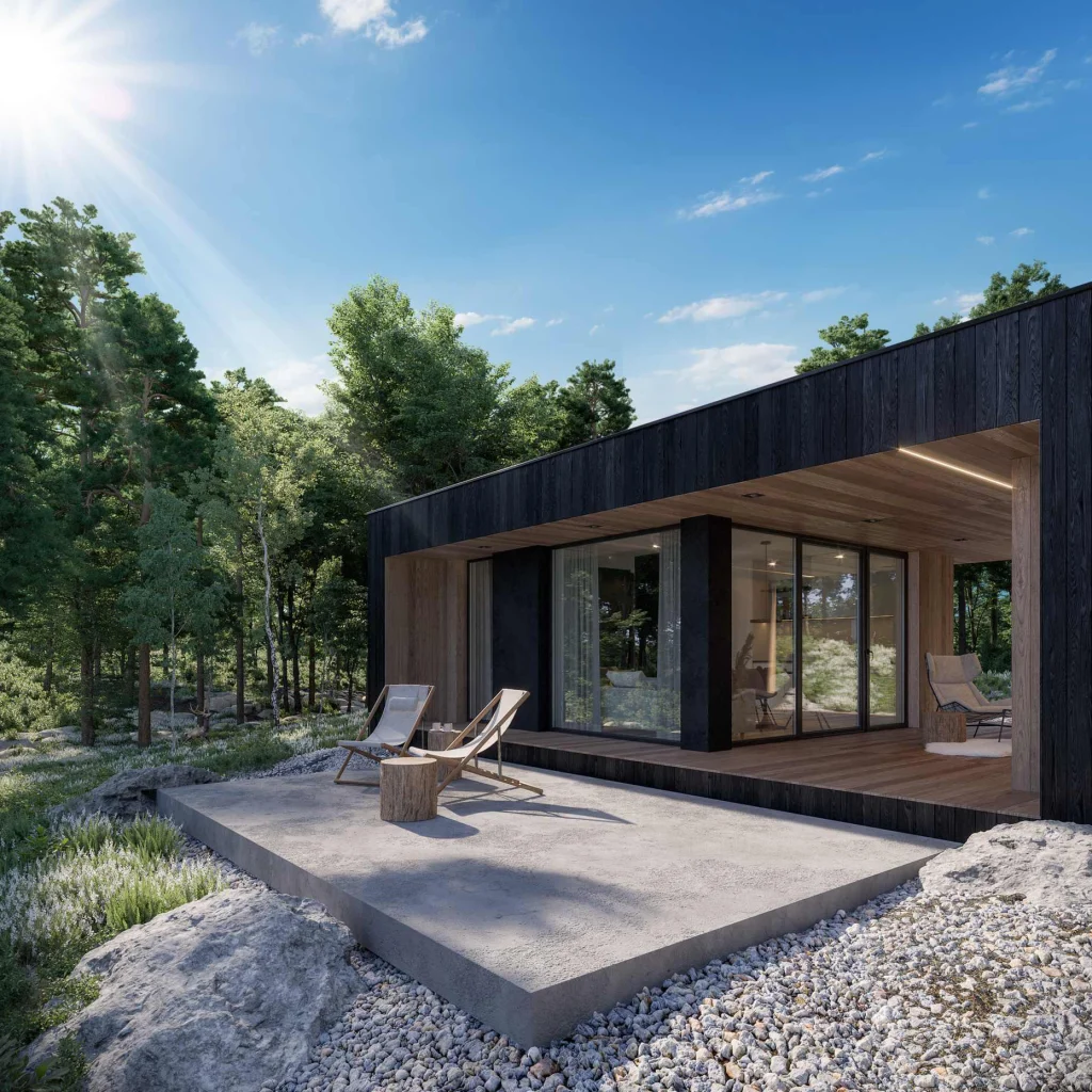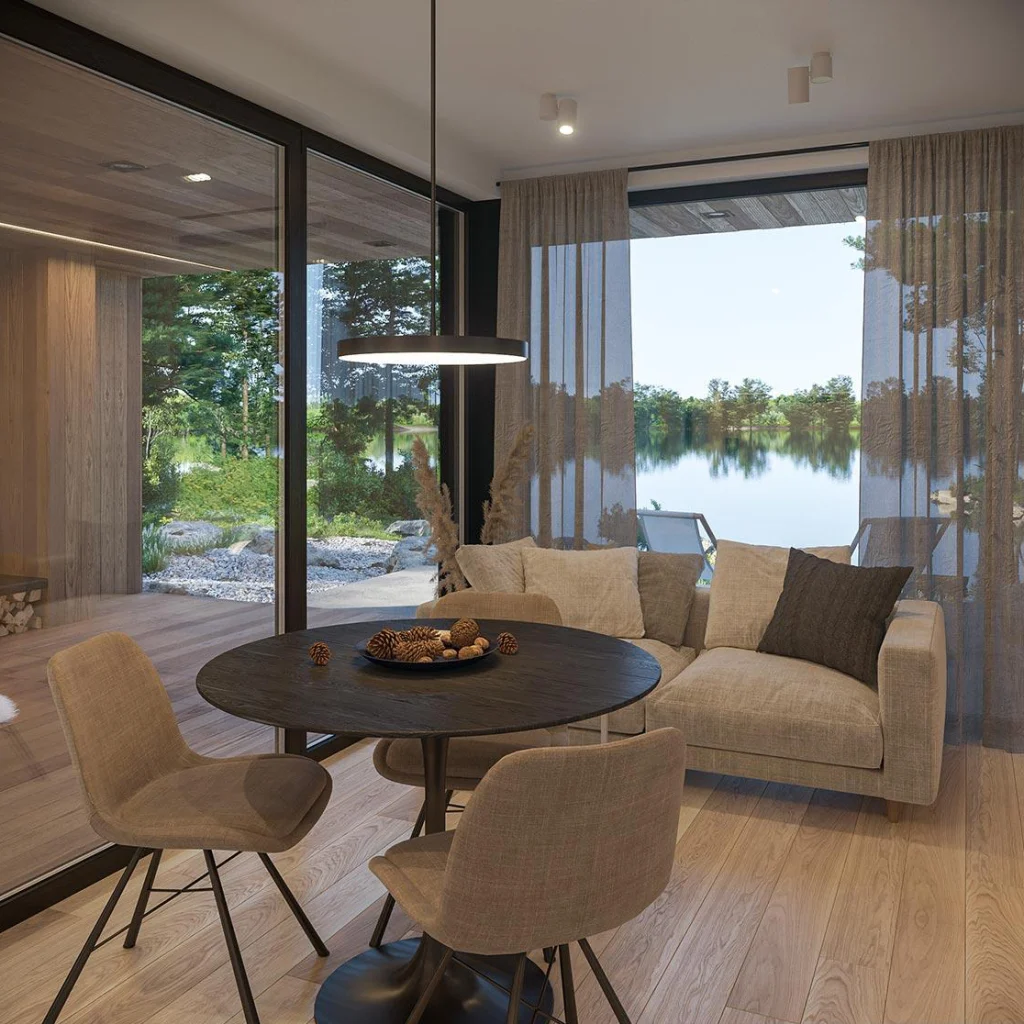 Дом сочетает в себе элегантный дизайн и продуманную функциональность. Благодаря простой, но выразительной архитектуре, он легко впишется в любой ландшафт, будь то лесистая местность или участок рядом с водоемом. Внешняя отделка из натуральной сибирской лиственницы подчеркивает гармонию с природой, а большие панорамные окна позволяют наслаждаться видами и создают ощущение простора.
