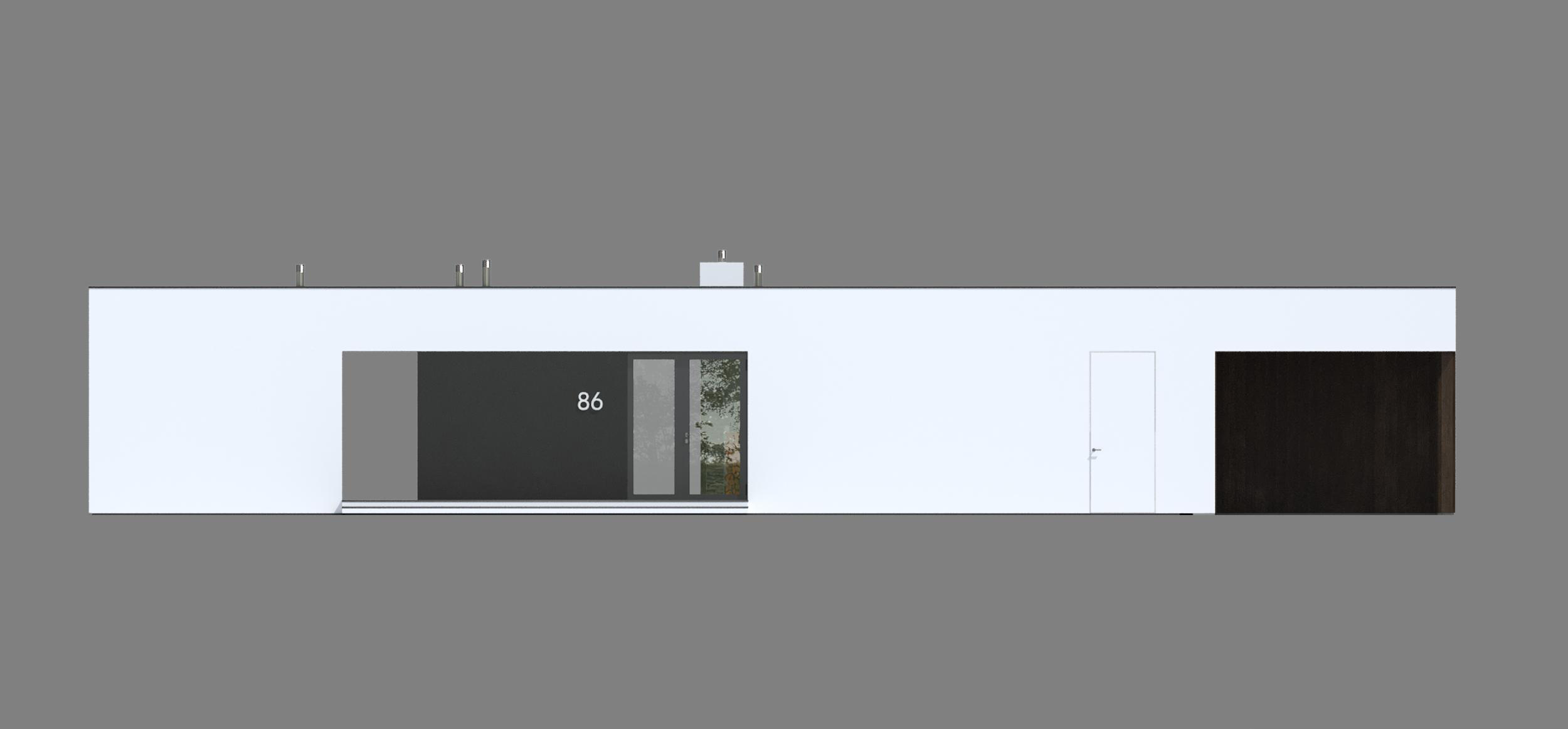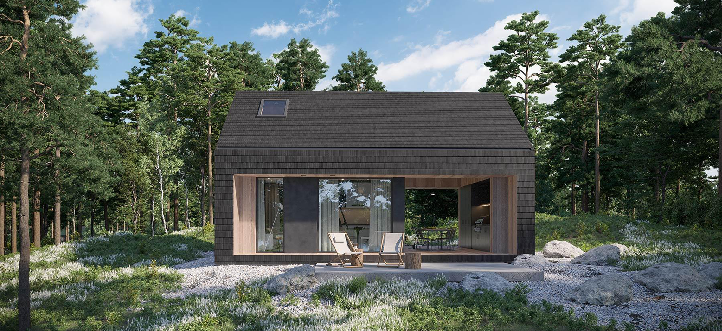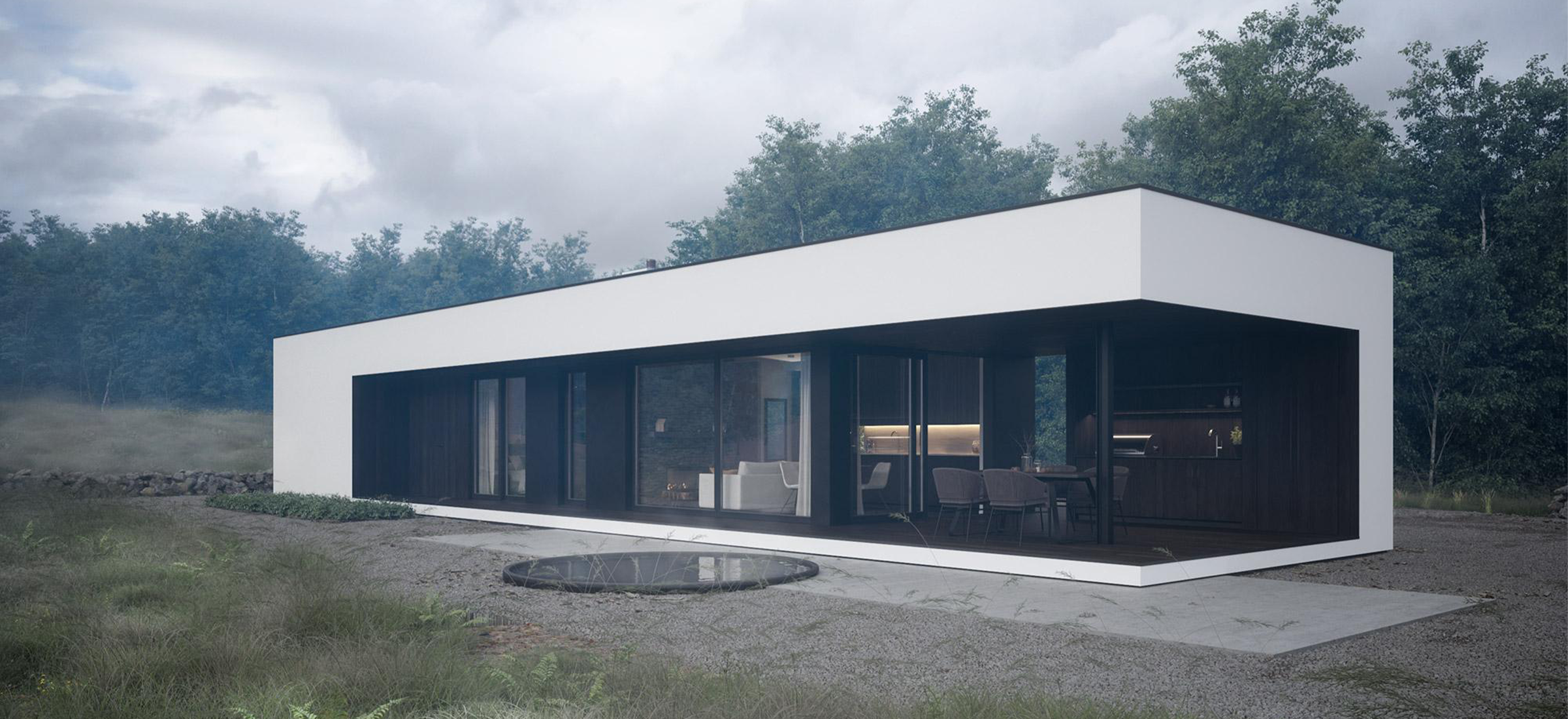 Одноэтажный дом проект H86 отличается камерностью и функциональностью. Входящие в дом попадают в гостиную с кухонным уголком и столовой, откуда открывается прекрасный вид через панорамное угловое окно. Далее можно выйти на террасу с внешней кухней, оформленную в скандинавском стиле. Ванная комната и спальня расположены с противоположной стороны, создавая интимную атмосферу.
