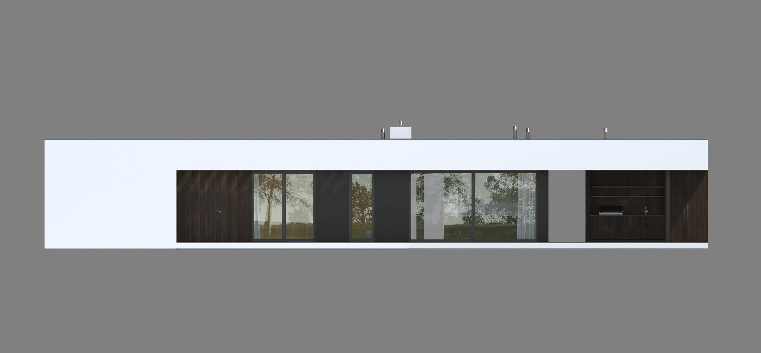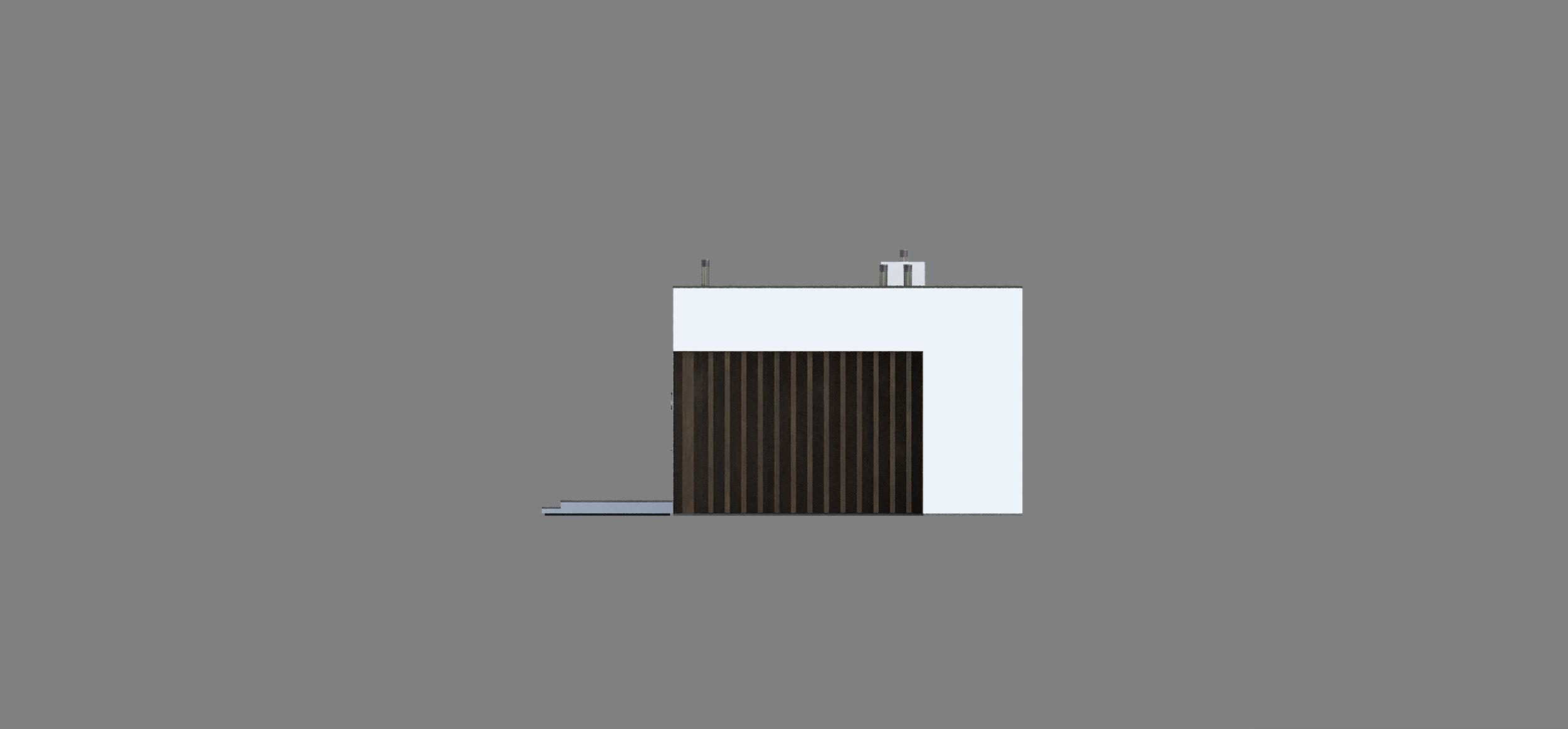 Этот проект дома станет находкой для поклонников минималистического стиля. Выполненный на прямоугольной основе с плоской крышей, он воплощает в себе современные тенденции архитектуры. Пространство кухни, объединенное с обеденной зоной и гостиной, создает ощущение свободы и легкости. Особенную атмосферу добавляет уютный камин, выделяющийся на фоне стены, декорированной камнем. Днем пространство увеличивается благодаря открытой террасе, которая соединяется с домом через панорамные окна, создавая плавный переход между внутренним и внешним пространствами.