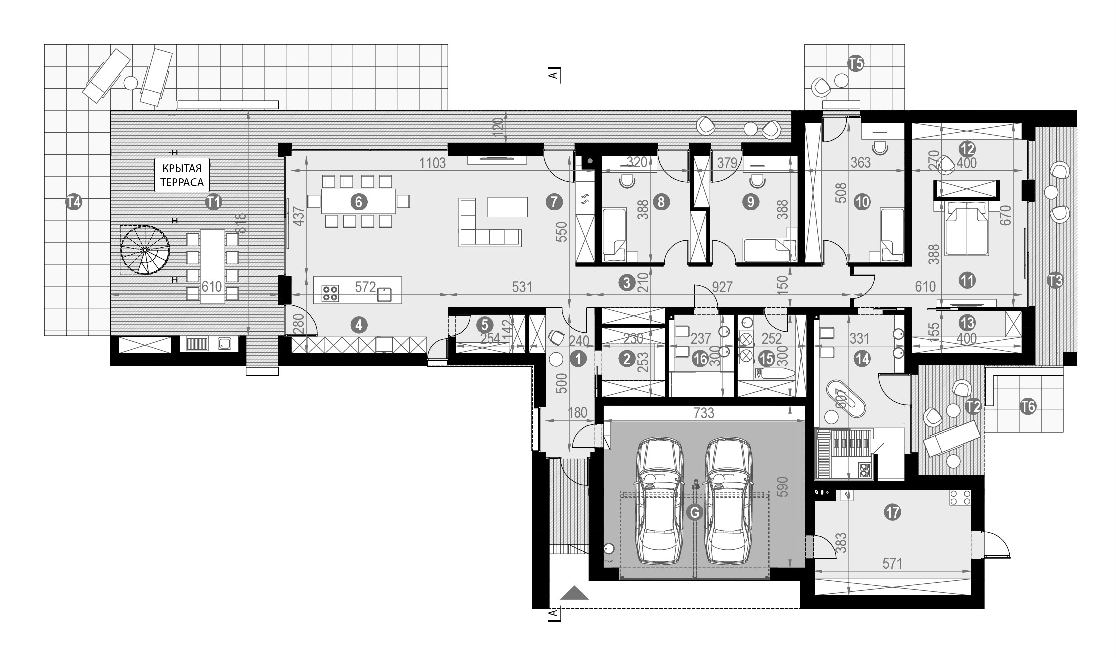 Полезная площадь — 242,15 м² Площадь гаража — 43,25 м² Минимальный размер участка — 39,05 x 25,08 м