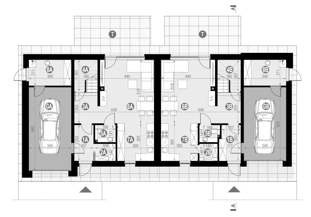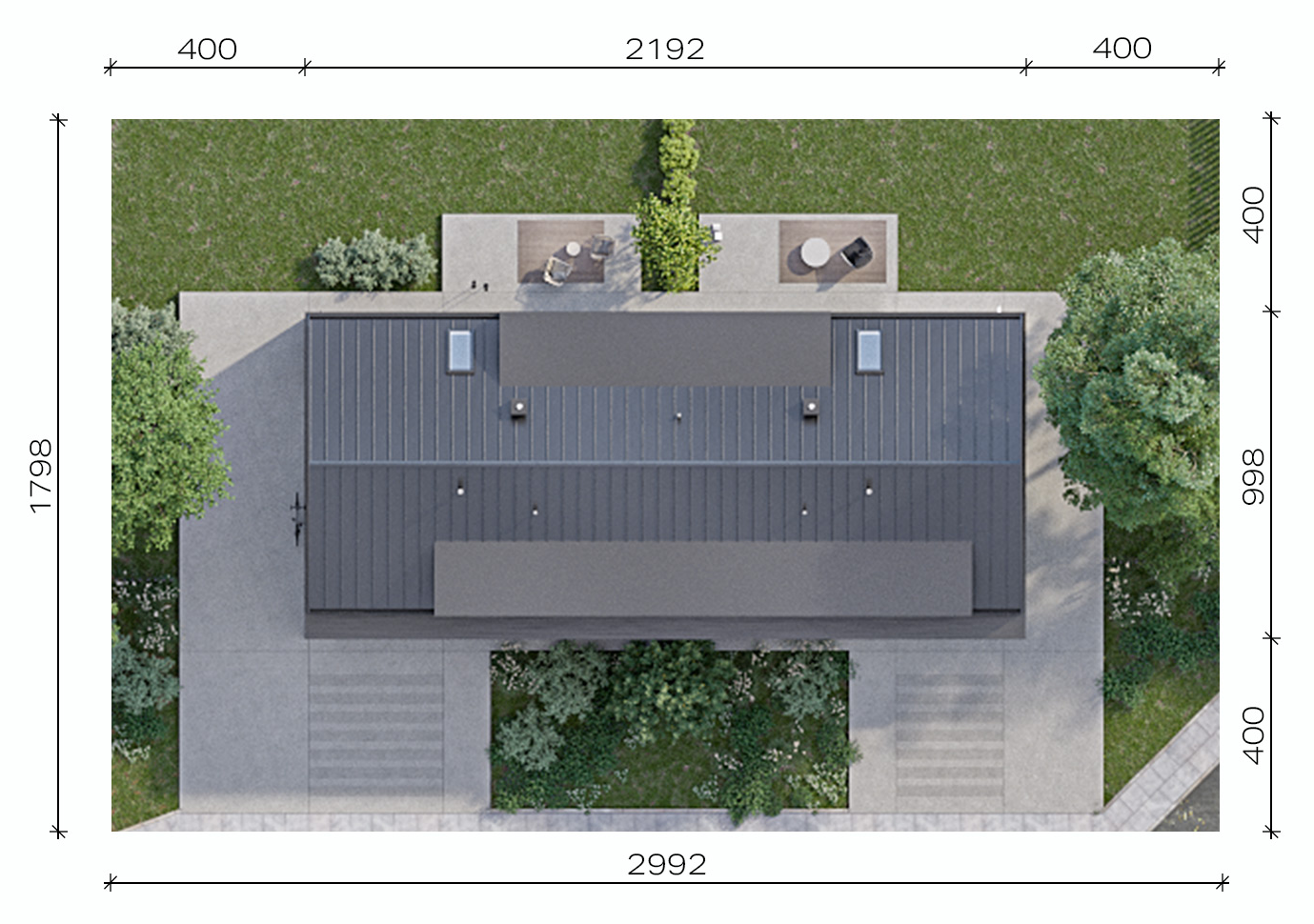 Полезная площадь — 131,3 м² Площадь гаража — 23,46 м² Минимальный размер участка — 29,92 x 17,98 м