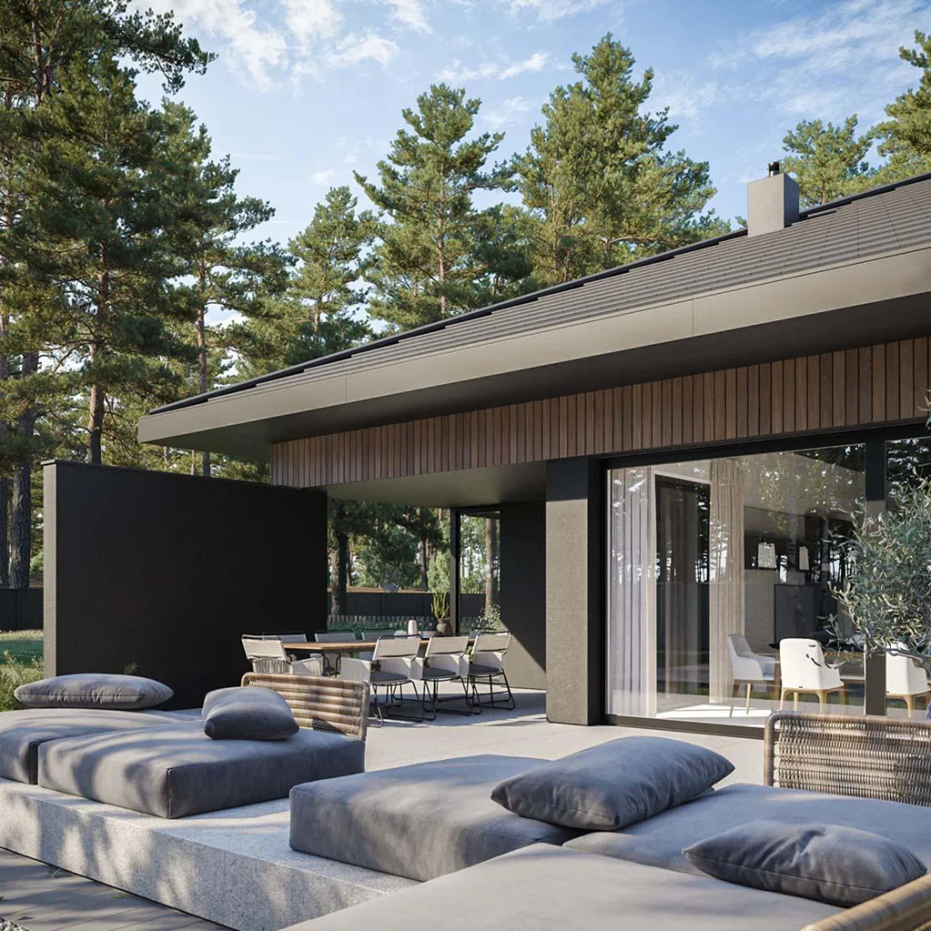Этот дом — воплощение современного стиля, где каждая деталь продумана до мелочей. Лаконичные формы, чистые линии и тщательно подобранные материалы создают элегантный и функциональный облик, который подчеркнет ваш вкус и статус.