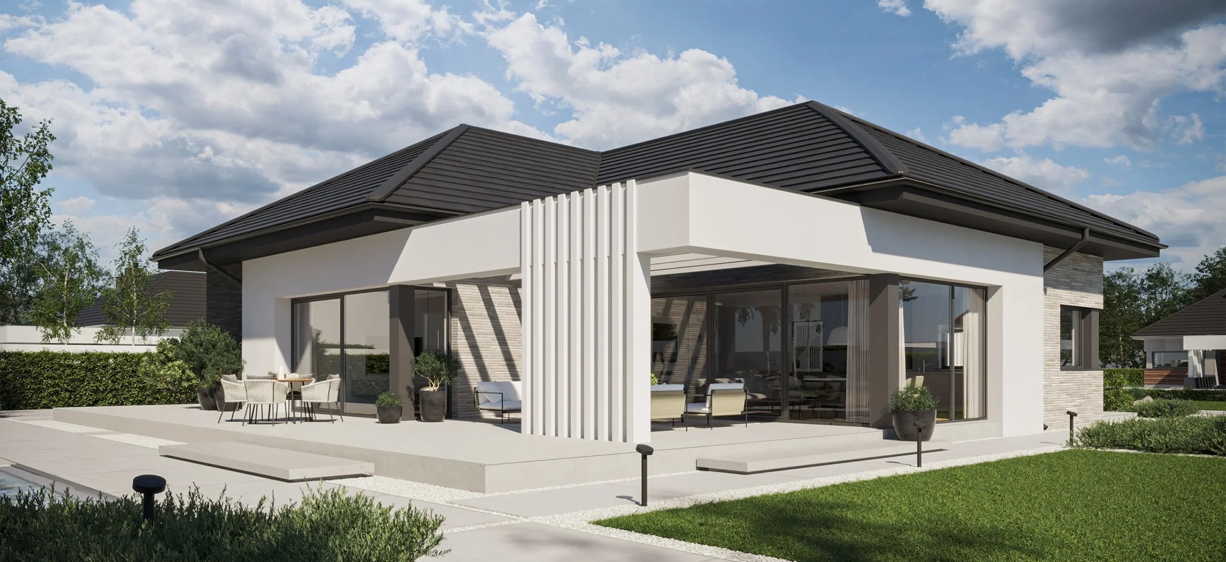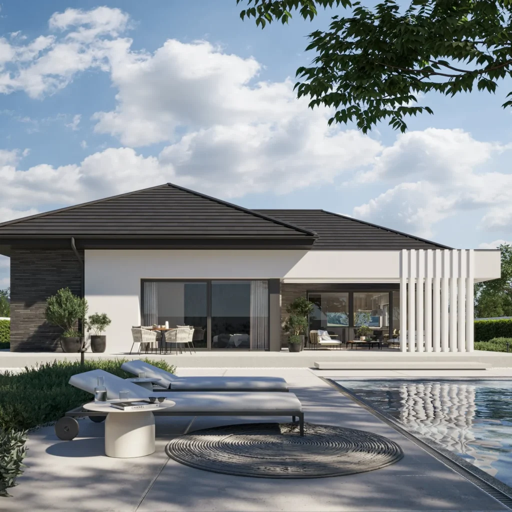 Этот дом — воплощение современного стиля, где каждая деталь продумана до мелочей. Лаконичные формы, чистые линии и тщательно подобранные материалы создают элегантный и функциональный облик, который подчеркнет ваш вкус и статус.