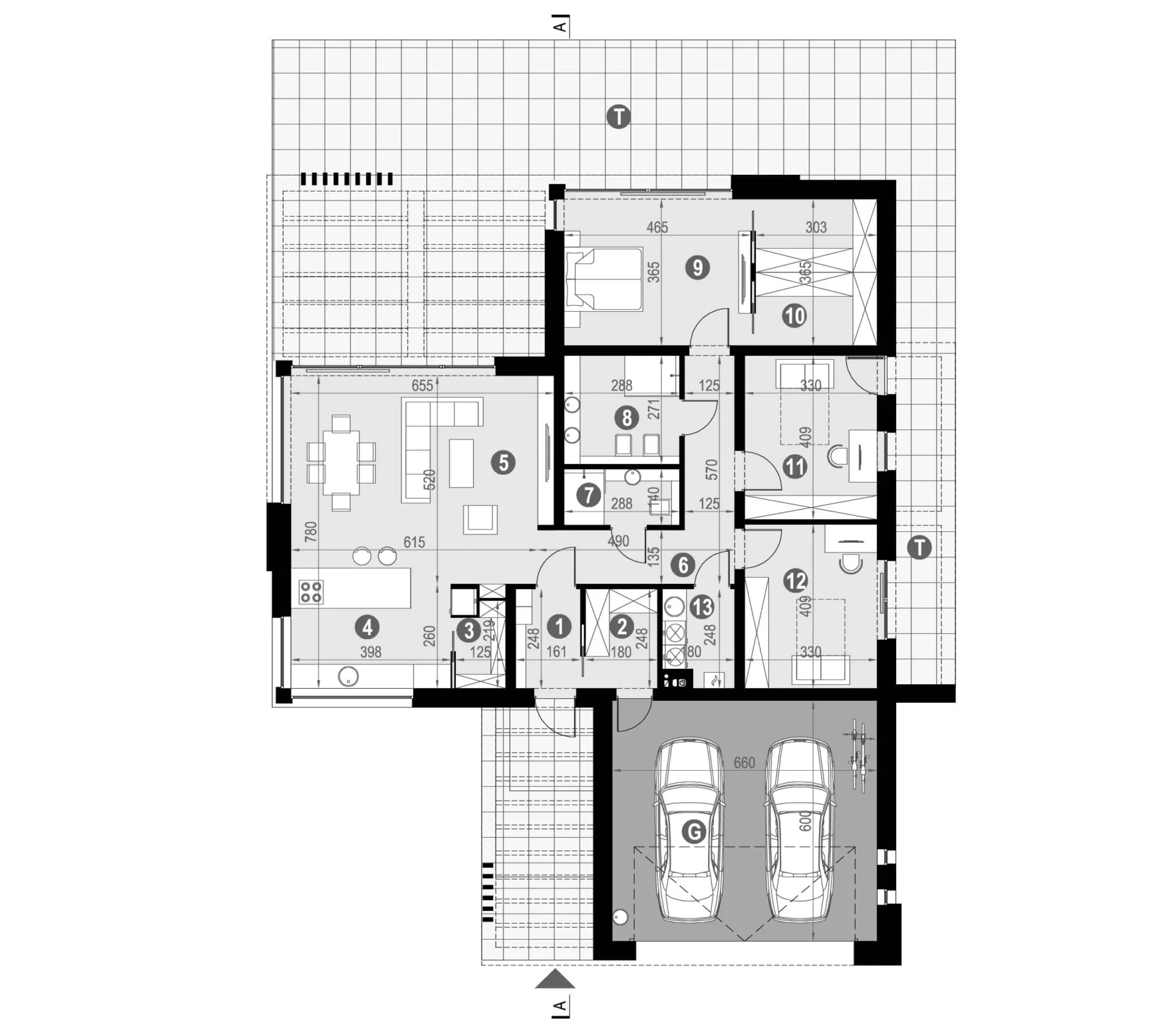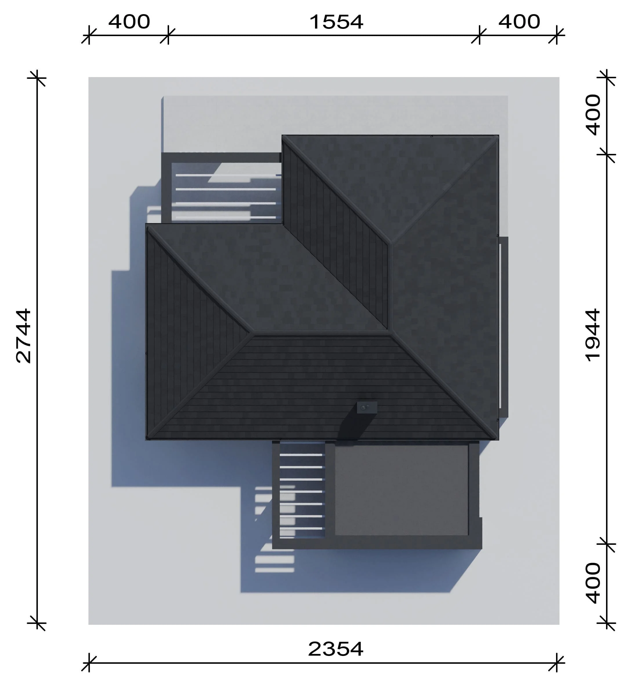 Полезная площадь — 138,54 м² Площадь гаража — 39,6 м² Минимальный размер участка — 23,54 x 27,44 м