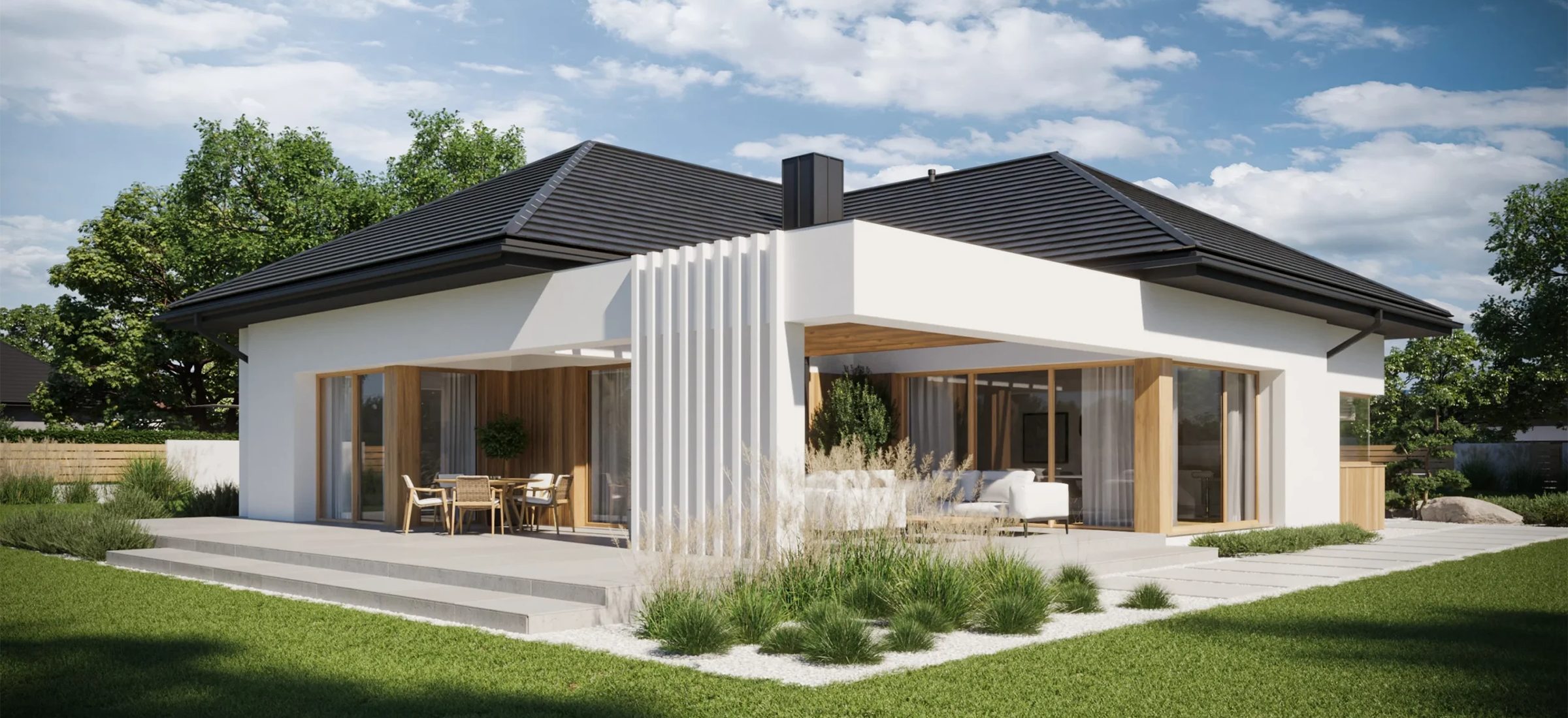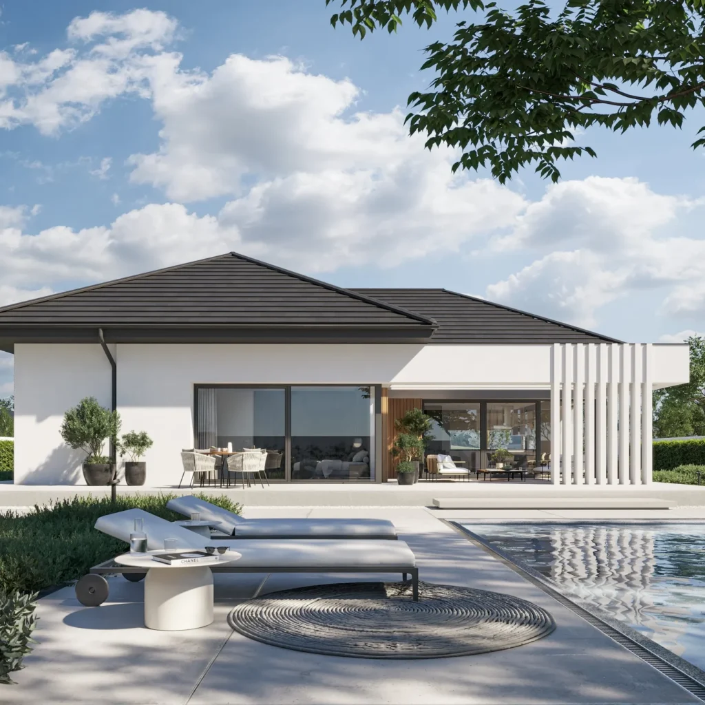 Этот дом — воплощение современного стиля, где каждая деталь продумана до мелочей. Лаконичные формы, чистые линии и тщательно подобранные материалы создают элегантный и функциональный облик, который подчеркнет ваш вкус и статус.