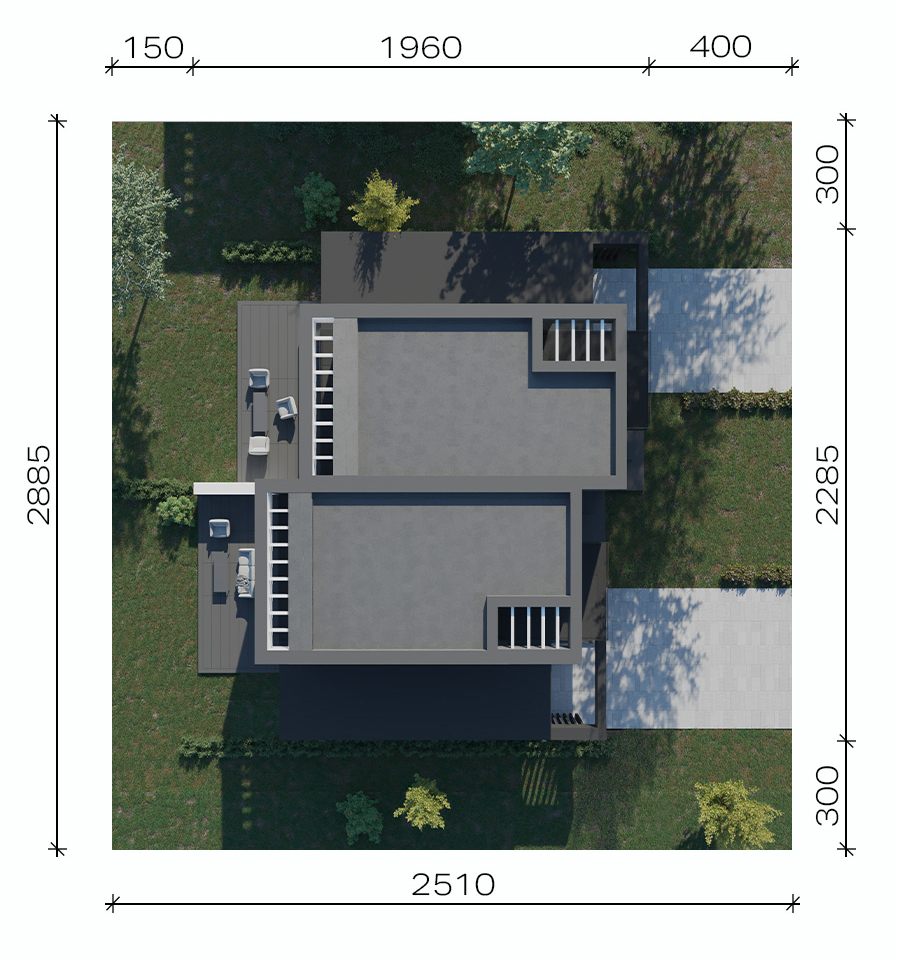 Дом строится на простых, лаконичных формах: жилую часть покрывает классическая двускатная крыша, тогда как над гаражом выполнена плоская крыша, плавно переходящая в перголу. Деревянная отделка фасада создает гармонию с природным окружением и подчеркивает близость к ландшафту. Дневная зона с двухэтажным остеклением открывает широкий панорамный вид на сад и террасу, обеспечивая максимальное естественное освещение.