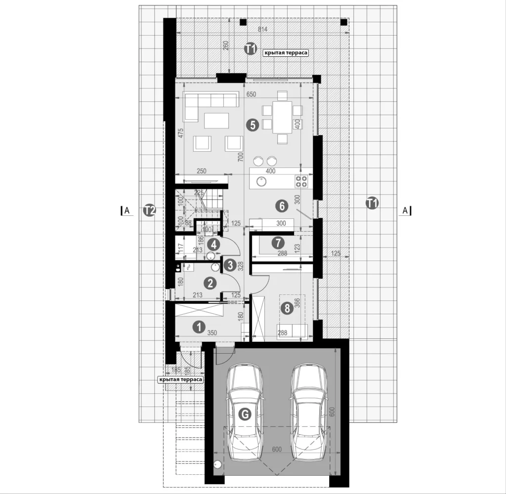 Полезная площадь — 123,69 м² Площадь гаража — 36 м² Минимальный размер участка — 15,65 x 27,45 м