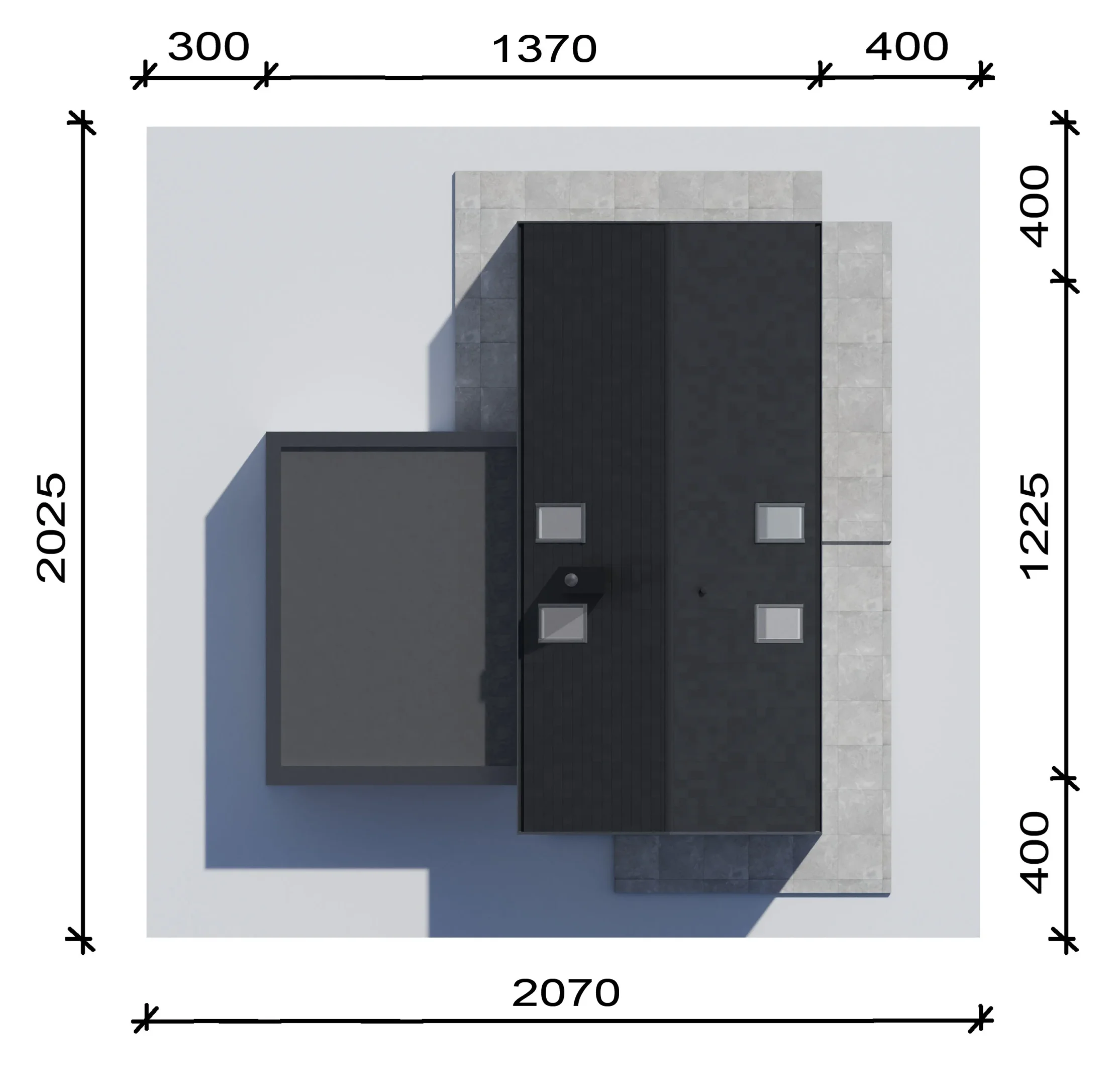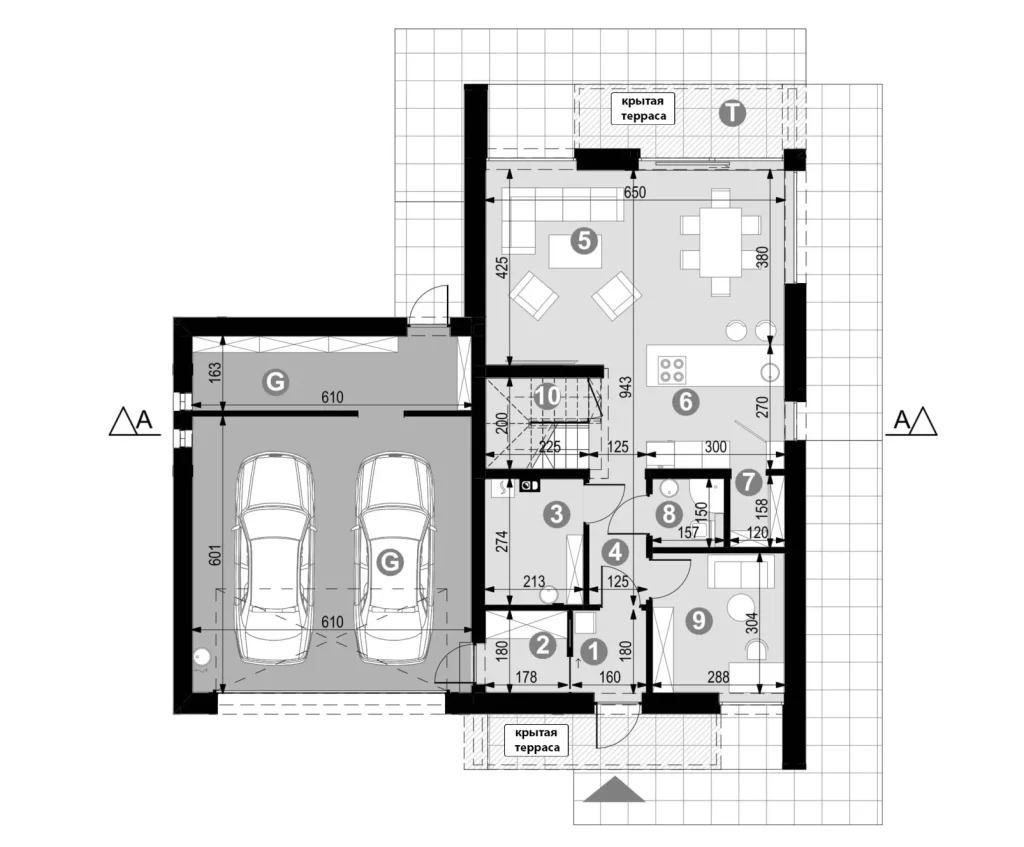 Полезная площадь — 113,79 м² Площадь гаража — 45,84 м² Минимальный размер участка — 20,70 x 20,25 м